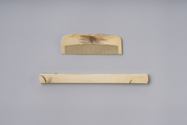 櫛は小ぶりで歯が短く、表側は棟に細い月と薄を、裏側は薄のみを金蒔絵で表わす。笄は太さが均一で厚みがあり、片端に細い月を、もう片端に薄を金蒔絵で表わす。髷に横に挿し通したとき、両端の月と薄が髷から突出し装飾となる。櫛、笄ともに「武蔵野」にちなむ意匠と考えられる。細く密に、靡くように描かれた薄からは、武蔵野を吹き渡る秋風が感じられる。(『歌枕 あなたの知らない心の風景』、サントリー美術館、2022年)
