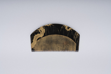 黒漆塗の地の両面に金蒔絵で柳を描く。厚塗りの幹に比べて、幽かに消えゆくような葉の描写が繊細である。歯の部分は全体に金蒔絵が施されているが、上部が弓なりに湾曲した形は橋を想起させる。古来歌枕として詠み継がれた宇治は「柳橋水車図屏風」(作品番号4・5)に代表されるように、柳、橋、水車、網代などのモチーフを組み合わせて表現されてきた。この櫛では柳と橋だけが抜き取られ、橋はさらに抽象化の度合いを深めている。湾曲した櫛の形を上手く利用した粋なデザインである。(『歌枕 あなたの知らない心の風景』、サントリー美術館、2022年)