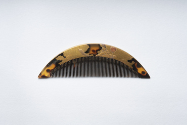 櫛の片面に、行灯の傍に座る平安貴族風の男性を、もう片面に山林と渓流、一匹の鹿を金蒔絵で描く。赤色を帯びた行灯には明かりが灯っているようだが、日本の古美術には行灯によって夜や闇を暗示するという約束事がある。「夜」や「暗い」、「鹿」というモチーフを総合すると、『古今和歌集』巻第五・秋歌下所収の「夕づく夜小倉の山に鳴く鹿の声のうちにや秋は暮るらむ」(紀貫之)に代表されるように、「小暗(をぐら)し」という意味を掛けて詠まれる「小倉山(をぐらやま)」を表現したものと推察される。歌枕の伝統を踏まえた謎解きの面白さがあるデザインと言える。(『歌枕 あなたの知らない心の風景』、サントリー美術館、2022年)