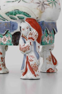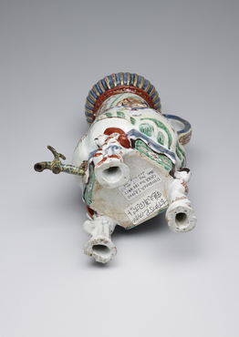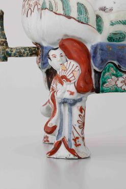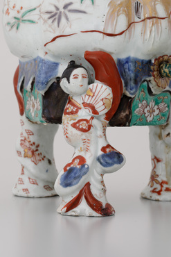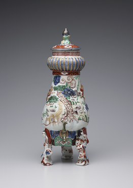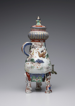 把手の付いた三足の蓋付注器です。茶やコーヒーなどの飲み物を注ぐための器と考えられます。表面には、松の大樹に巣をかけて四羽の雛を育てるのに忙しい鶴のつがいのようすが、型打ち成形のレリーフによって表現され、赤、紫、黄、緑、黒の上絵と金彩で絢爛に着彩されています。ポット下部の孔には金属製の蛇口が取り付けられており、蛇口自体も青と黄色でマーブル状に塗装されています。団扇を手に、浮かれてポーズを取る、小袖姿の男女の立ち姿をかたどった三本の脚が、ポットを支えています。(『IMARI/伊万里 ヨーロッパの宮殿を飾った日本磁器』サントリー美術館ほか、2014年)