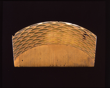 同心円の一部を重ね、扇状のかたちが連なる「青海波」の文様を全面にあしらった櫛。西域を起源として伝わった文様といわれ、日本でも古くから用いられてきたが、水の表現として使われたのは中世以降とみられる。「青海波」の名称は雅楽の舞曲から名付けられたもので、装束にこの文様が用いられる。(『水と生きる』サントリー美術館、2007年)
