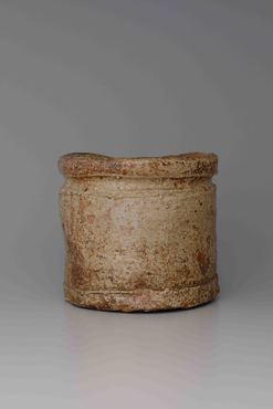 口縁下を絞り、内側に蓋受けが張り出すいわゆる矢筈口の水指。口縁は片側が大きく窪み、起伏のある口造りとなる。矢筈口の絞りに対応して、裾に浅い箆目を巡らし安定した姿にまとめる。口から胴回り全面に薄く灰釉を掛けながら、所々赤い土膚を現わし、明るく穏和な中に独特の味わいを見せる。内面に「×」の窯印を箆書きするが、同じ窯印を有する類似の水指も知られる。自然釉以外無釉が主流の信楽だが、施釉ものの代表的な作品。(『日本のやきもの千二百年 奈良三彩から伊万里・鍋島・仁清・乾山』サントリー美術館、2001年)