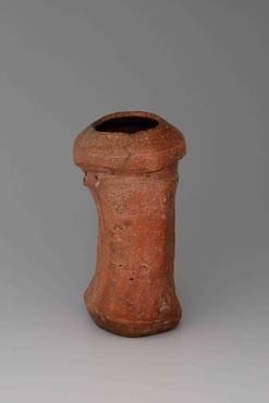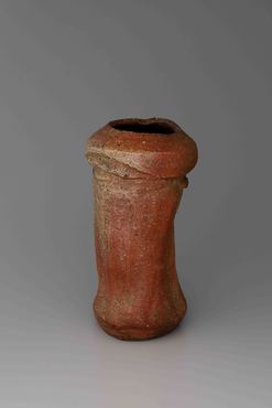 伊賀焼と同様、信楽でも歪んだ破格の茶陶が焼かれた。本品は、肩と底を円筒形にし、肩下を絞って段をつけ、胴の前後は大きく押し込んで箆で縦に面取りし、大きく歪ませる。口縁は内側にすぼませ、背面の段下に三つの擂座(円形の突起)をつける。全体は赤褐色に焼き締まり、荒い長石粒の噴き出しが見られ、表の片側、肩下から胴中程に淡緑色の自然釉がかかる。表裏の段下中央に、掛花生の金具の穴を塞いだ痕がある。内面に「×」の窯印を箆書きする。(『日本のやきもの千二百年 奈良三彩から伊万里・鍋島・仁清・乾山』サントリー美術館、2001年)