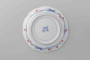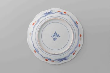 くっきりとした十弁花形の堂々とした大皿です。四季の花丸文は輪郭線を染付の青で描き、色絵の赤・黄・緑と金彩で明るく軽やかに彩っています。裏文様もとても丁寧に描いておます。古伊万里金襴手と鍋島の特徴が混在する希少な作例です。イギリスの貴族の館「オードリー・エンド・ハウス」に類品が所蔵されています。しかし、本作は日本に伝世した品という情報があります。海外と日本の両方に流通した例と言えます。(『リニューアル・オープン記念展Ⅲ 美を結ぶ、美をひらく。美の交流が生んだ6つの物語』、サントリー美術館、2020年)