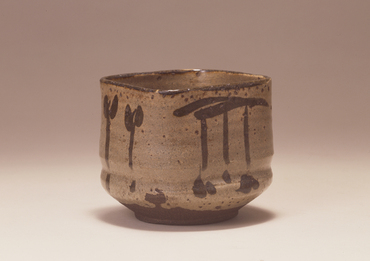 筒形に轆轤挽きした後腰に括りを付けて、上部を四方に成形し、低い高台を削り出す。釉は腰まで薄く掛け、口縁に銹絵具を塗る。この器形は唐津で好まれ、類例が多い。胴の各面に、交互に簡略な吊るし柿と双葉の植物のような文様を力強い線で描く。縦の線が連なる様はリズミカルである。こうしたデザインには美濃の志野や織部の影響がある。(『日本のやきもの千二百年 奈良三彩から伊万里・鍋島・仁清・乾山』サントリー美術館、2001年)