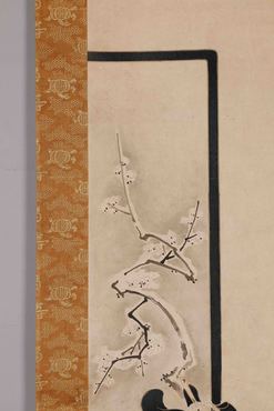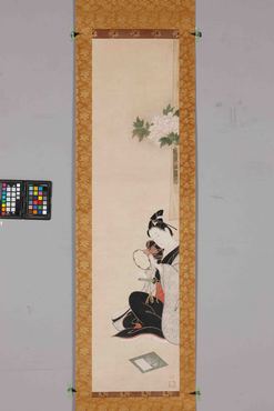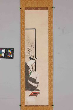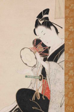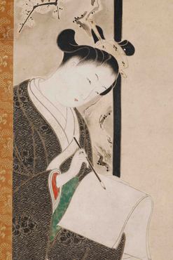 右幅に鼓を打つ若侍を、左幅には手紙を書く女性を描く。上目遣いの視線は、互いに見交わすようであり、離れた相手を思うようでもある。若侍の上の大輪の牡丹や、女性の背後の衝立の白梅の描写も象徴的である。石川豊信(1711-1785)は、寛保から宝暦(1741-1764)頃に活躍した浮世絵師で、紅絵や紅摺絵の美人風俗画で人気を得た。(『日本を祝う』サントリー美術館、2007年)