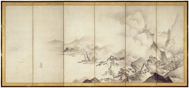 中国湖南省にある洞庭湖の南、瀟水と湘水が合流する一帯の勝景を選んだ瀟湘八景を描く屛風。右隻右遠方より江天暮雪、山市晴嵐、瀟湘夜雨、遠浦帰帆、左隻右より平沙落雁、漁村夕照、煙寺晩鐘、洞庭秋月が、四季の推移を織り交ぜながら中央の水景をめぐるように配置されている。久隅守景(生没年不詳)は、狩野探幽門下の四天王の一人であったが、のち狩野派を離れた。一時は加賀にいたが、田園風俗を活写した清新な画風でも知られる。(『水と生きる』、サントリー美術館、2007年)