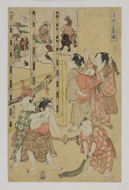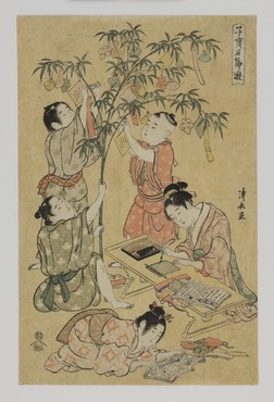 正月7日の人日・3月3日の上巳・5月5日の端午 ・7月7日の七夕・9月9日の重陽という五節句を主題にした浮世絵の揃物で、子どもたちが戯れる様子が表される。全5図のうち、桃の節句の上巳では雛祭の様子が描かれる。端午では金太郎などの幟やはしゃぐ幼子をとらえる。七夕では短冊を笹に結ぶ様子がみえる。鳥居清長は江戸時代中期に活躍した浮世絵師。季節の節目に健やかな子どもが描写され、子孫繁栄の願いがこめられている。(『サントリー美術館プレミアム・セレクション 新たなる美を求めて』サントリー美術館、2018年)