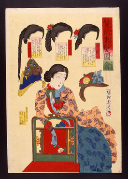 ドレスを着た束髪の女性たちを画面の中心に置き、周囲に複数の束髪の図と結い方の説明を配した三枚組の錦絵。右図は「下ゲ巻」「上ゲ巻」「少女の下髪」、中央図は「半結び」「マガレイト」「イギリス結下ゲ」、左図は「三ツ割」「渡辺巻」「英吉利結」「和嵜結」「同變形(おなじくかわりがた)」となっており、各図全てに題名が記されていることから、セット売りではなく、好みの髪型が載っているものを選んで購入したものと思われる。束髪や帽子は切り取って女性に被せ、髪型のイメージを膨らませることができる仕組みになっている。束髪の髪飾りには花やリボンなどが使われ、本作でも束髪や帽子のアクセントとなっている。西洋風の装飾を施した花瓶や椅子、洋書などが描き込まれており、西洋化が報復や髪型だけでなく、生活全般に影響を与えている様子がうかがえる。(『リニューアル・オープン記念展Ⅰ ART in LIFE, LIFE and BEAUTY』、サントリー美術館、2020年)