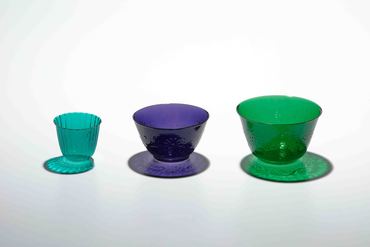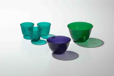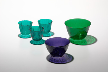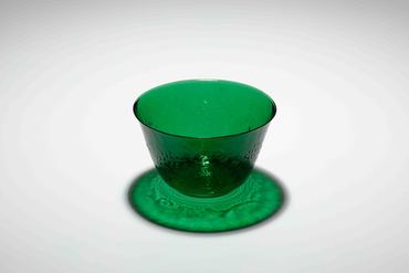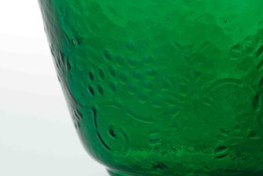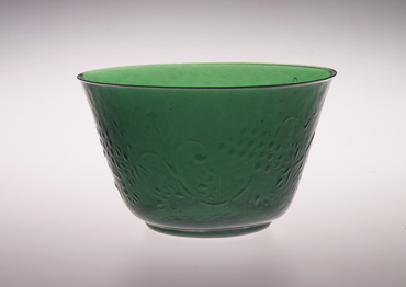 やや端反りの緑色型吹きの鉢。肉厚は側面がやや厚く、底面が薄手である。側面には多数の気泡が認められる。葡萄の房は三ヶ所に配され、蔓草で繋ぐが、途中でとぎれた部分もあり、型をもたせるものと推定される。高台の裏面および側面にも型跡が残っている。(『サントリー美術館コレクション「ガラス・その煌きとときめき」展』、下関市立美術館ほか、2003年)