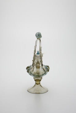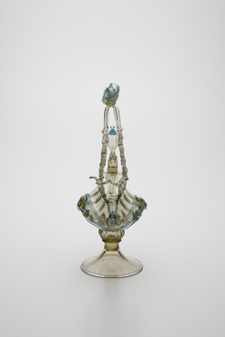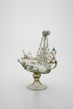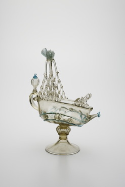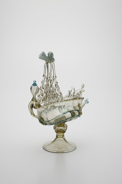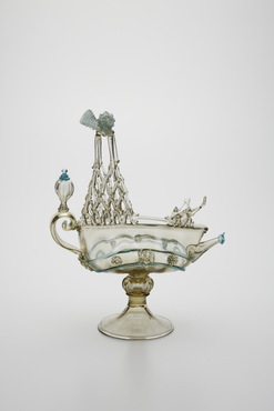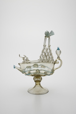 金属製の食卓用装飾箱ネフ(nef)に由来し、ネフあるいは水差として作られた船形容器。ヴェネチア派の画家の娘アルミニア・ヴィヴァリーニ(Arminia Vivarini)が、1521年にガラス製の船形容器を作る特許を取得したという記載が残っている。船腹の中央には人面が溶着され、マストは一段ずつ一本のガラス棒で編み上げられ、頂に豊穣のシンボル・コーヌコピア(ヤギの角)が付される。海洋国家ヴェネチアを象徴する意匠といえよう。(『サントリー美術館プレミアム・セレクション 新たなる美を求めて』サントリー美術館、2018年)