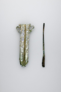 二連瓶(G29-1)、双把手付二連瓶(G28-1)、双把手付二連瓶(遠山記念館)、双把手付二連瓶(岡山市立オリエント美術館)は吊手のないタイプの二連瓶です。胴体の基本的な形態は同じですが、細部の作りはそれぞれ異なります。二連瓶(G29-1)、双把手付二連瓶(G28-1)には本体に糸状の巻き付け装飾が施されていますが、双把手付二連瓶(遠山記念館)、双把手付二連瓶(岡山市立オリエント美術館)にはありません。双把手付二連瓶(G28-1)、双把手付二連瓶(岡山市立オリエント美術館)は左右両側面の口縁付近に三角形の把手が付き、双把手付二連瓶(遠山記念館)では胴中央付近から口縁に向かって波状の貼り付け装飾が施されています。 また、口縁部にも作り方の違いを見ることができます。双把手付二連瓶(G28-1)は2つの口を分ける壁が口端より一段低くなっていますが、これは道具で挟んだ一よりも手前(吹き竿に近い位置)で切り離したからです。それ以外は口端と壁の高さが同じなので、道具で挟んだ部分に合わせて吹き竿から切り離したとみられます。(『吹きガラス 妙なるかたち、技の妙』、サントリー美術館、2023年)