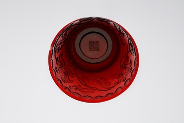 銅赤ガラスによる鉢で、側面に三輪の牡丹の花と葉による唐草文から成る宝相華唐草文様を浮彫りにしている。口辺部は如意頭風の文様が巡り、胴の最下部は蓮華文を配している。削り出しによる高台中央部に、篆刻風の字体で、「大清乾隆年製」の銘が線彫りで記されている。見込みは滑らかで光沢があるが、側面は研磨跡が巡る。このことから、一旦高台のない鉢の形に吹いた後、側面の装飾、高台ともに削り出して形作られたと推測される。乾隆帝の時代のガラス鉢は、こうした工程で成形される場合が多い。(『ガレも愛した―清朝皇帝のガラス』、サントリー美術館、2018年)