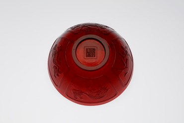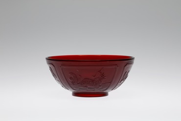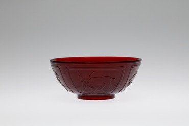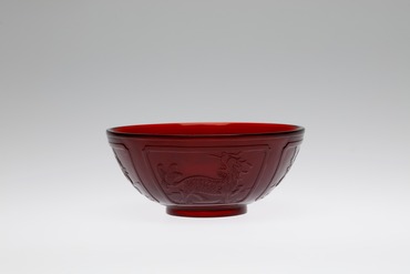 側面に四つの窓枠を配し、皇帝の象徴である龍、霊獣で獣類の王である麒麟、招福駆邪の獅子、長寿を表わす鹿が巡る鉢。銅による発色の、力みなぎるような紅色が印象深い。素地には白い不純物や気泡も散見される。削り出した高台の中央には、太い正方形の枠の中に篆刻風の字体で「乾隆年製」の銘が浮彫りにされている。おそらく皇室の安泰を祈願した意匠であろう。モティーフとなる雄々しい動物や霊獣の表情に、そこはかとない愛嬌が感じられる。(『ガレも愛した―清朝皇帝のガラス』、サントリー美術館、2018年)