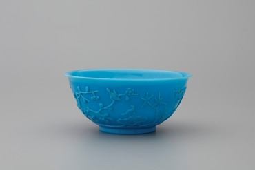 型吹き成形後、文様と高台を削り出した鉢である。側面に松・竹・梅に鵲、菖蒲・蓮に鷺といった、春から夏にかけての花鳥図が巡り、色調も涼しげである。(『ガレも愛した―清朝皇帝のガラス』、サントリー美術館、2018年)