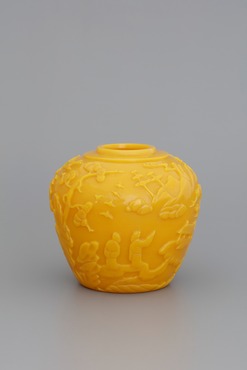 不透明の黄色ガラスを型吹き成形した後、騎馬人物図を彫り描き出している。高台は浅く、内側に擦って形作る。俗世を離れた清貧の詩人が、帽子を被って驢馬に乗り、琴を担いだ侍者を従え、山中の家屋から出かけていく。鳥が飛ぶ松林を抜けた先には、ふたりの文人が並び、その先の楼閣を指差して会話しているようだ。静寂に満ちた隠遁の文人の生活を表わした意匠であろう。(『ガレも愛した―清朝皇帝のガラス』、サントリー美術館、2018年)