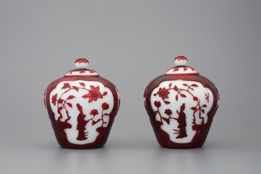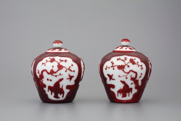 中国絵画に、宮廷女性の風俗を題材にした仕女図というジャンルがある。この壺は、乳白色ガラスにローズ系の紅色ガラスを被せ、胴部に設けた三つの窓枠に異なる仕女図を配している。梅の樹の下で読書をする者、咲き誇る海棠の下で横笛を吹く者、また牡丹の花をめでる者と、いずれも教養豊かでたおやかな女性の姿には、芳しい香りが漂うかのようだ。蓋のつまみは花弁を削り出し、高台は紅色ガラスを円形に削り取っている。(『ガレも愛した―清朝皇帝のガラス』、サントリー美術館、2018年)
