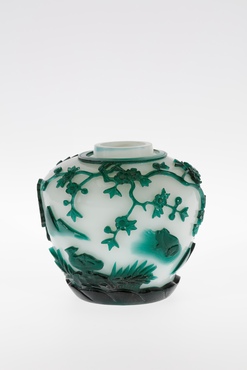 水辺の風景を表わした清々しい緑色の壺。蓮に鷺、梅の樹の下には川が流れ、つがいの鴛鴦が泳ぐ。中国で蓮は尊い花として敬われ、また仏教思想とも結びついて、さまざまな意味を付与され吉祥の意匠として親しまれてきた。蓮花と鷺とを組み合わせた蓮鷺図は、蓮と連、鷺と路の発音が通ずるため、「一路連科」(科挙の試験に続いて合格する)、つまり出仕を願う文人の祈りが込められた寓意。絵画、漆器、陶磁器の意匠として繰り返し表現されてきた。さらに蓮は、アール・ヌーヴォーの時代、東洋趣味の表われとして、ヨーロッパ工芸品のモティーフにもたびたび登場した。ただしその場合、本来の寓意ではなく、モティーフがもつ特異な形態や表現方法の差異が興味の対象となっている。本作品の蓮の茎が描く曲線や捲れた葉の描写には、エミール・ガレの《花器「かわせみ」》(ガラス377)の水草の表現方法と多くの共通点が窺えるだろう。(『ガレも愛した―清朝皇帝のガラス』、サントリー美術館、2018年)