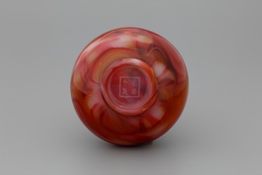 マーブル状の色ガラスで、黄色・紅色・乳白色が混じり合い、美しい大理石文様を作り出している。高台は別に作られて溶着され、中央に「乾隆年製」との銘がある。このように清代には、一見しただけでは見分けも付かないほど見事に、翡翠や大理石などの貴玉や、さらには鼈甲といった高価な工芸素材を模したガラス素地が多く開発された。(『ガレも愛した―清朝皇帝のガラス』、サントリー美術館、2018年)