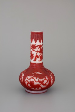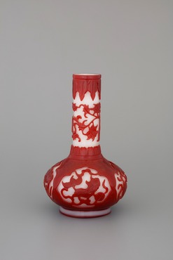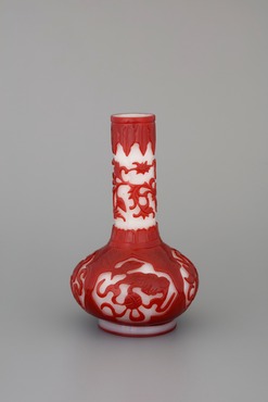 乳白色ガラスに紅色ガラスを被せ、胴部に設けた四つの窓枠に、それぞれ異なる姿態の獅子文を彫り出した瓶。二頭の獅子が向き合う場面を中心に、他の三面には繍球と戯れる三態の愛らしい玉取獅子を描き出している。二頭の獅子がじゃれ合い、互いの毛がもつれ合って珠となり、その中から児獅子が生まれたという、まさに古代中国からの故事が図像となって巡らされている。頸部に宝相華文、口縁部に蕉葉文が巡る。(『ガレも愛した―清朝皇帝のガラス』、サントリー美術館、2018年)