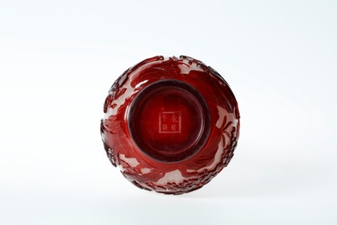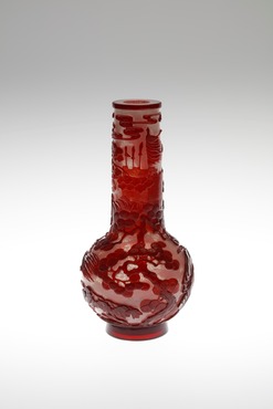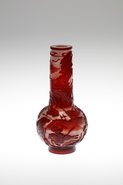林の中を疾走する馬に跨り、長刀を構えて騎乗戦を繰り広げる二人の武将を彫り描いた瓶。背景には岩山に城郭がみえ、城壁には鉾と旗とが林立する。こうした文様は、モティーフの輪郭に沿って点を穿ち、点と点の間をヤスリで削ることで彫り出す玉細工の技法が応用されている。素地となるスノーフレーク(雪片)ガラスは、工房で偶然出来た産物で、石英の粉と細かい気泡とが内包され、まるで雪が舞うようであるために、こう呼ばれた。(『サントリー美術館プレミアム・セレクション 新たなる美を求めて』サントリー美術館、2018年)
