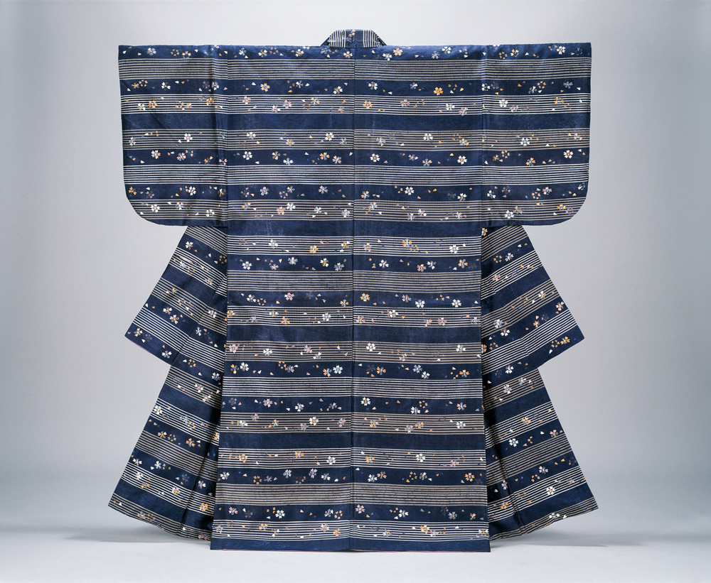 藍を下染めしたと思われる鉄紺色の地に、白と黄の段で間道(室町から江戸時代に舶載された縞や格子の織物)風に横縞を織り表し、薄紅、白、黄、薄茶、鼠などの色糸で桜花を刺繍する。はらはらと散り行く様や、花びらを失って花蘂だけになった様など、その表現は多彩である。桜花の間には、銀の摺箔により蜘蛛の巣が細緻に表現される。夜を思わせる鉄紺地に浮かぶ乱れた桜花と蜘蛛の巣という意匠は、どこか仄暗い情念を感じさせる。(『サントリー美術館プレミアム・セレクション 新たなる美を求めて』サントリー美術館、2018年)
