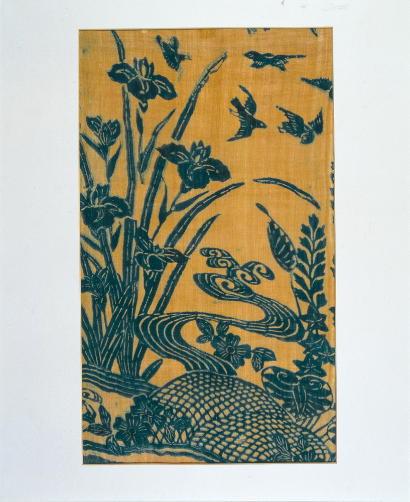水辺の風景を主題とした模様で、同様の意匠は上流階級に好まれて数多く染められた。それらの多くは色数が多く華やかな紅型であるが、一方で、藍の濃淡と墨だけで染めた藍型の作品も残っている。本作も芭蕉の黄色地に藍のみで模様を染めており、独特の趣に仕上がっている。(『琉球 美の宝庫』サントリー美術館、2018年)