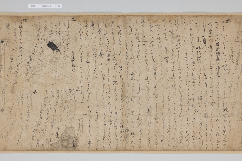 善教房という僧侶がある貴族の館を訪れ、家の者たちに仏の教えを説くさまを描く。独立した詞書はなく、ストーリーは絵の中に書き込まれた登場人物の台詞によって展開する。特に屋敷の使用人たちはいずれもしたたかで、あれこれ言い返されてしまう善教房の姿が笑いを誘う。内容は宗教色が濃いが、画風は親しみやすい素朴な白描。問答が繰り広げられる室内描写や使用人の仕事ぶりにリアリティがあり、その姿に共感する庶民が教化対象だったと考えられる。(『サントリー美術館プレミアム・セレクション 新たなる美を求めて』サントリー美術館、2018年)