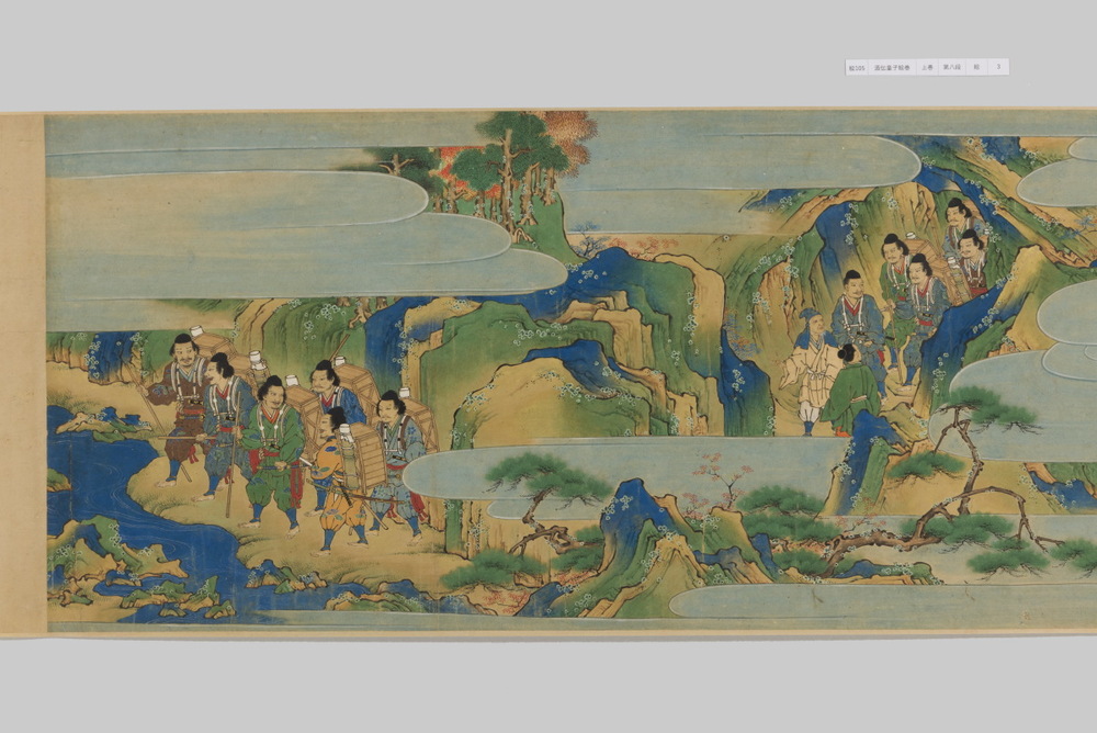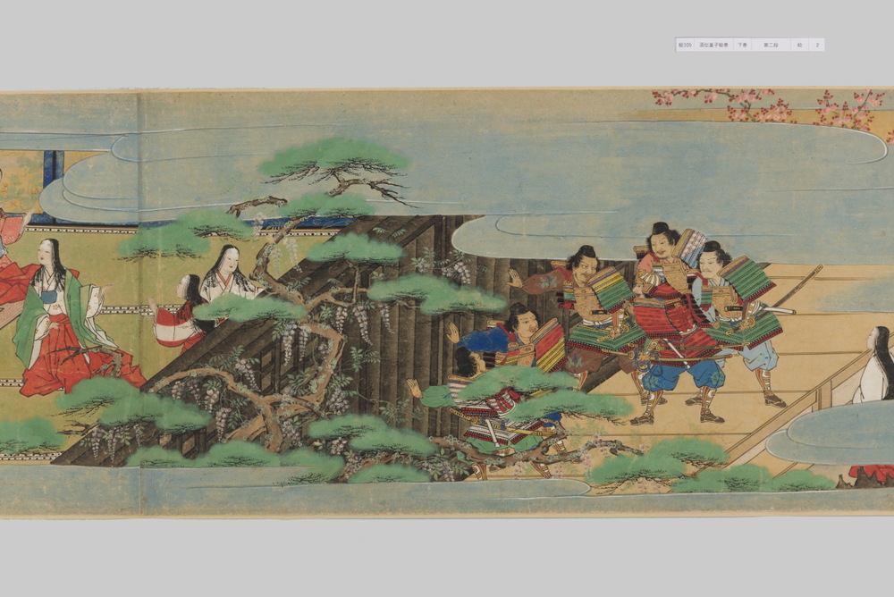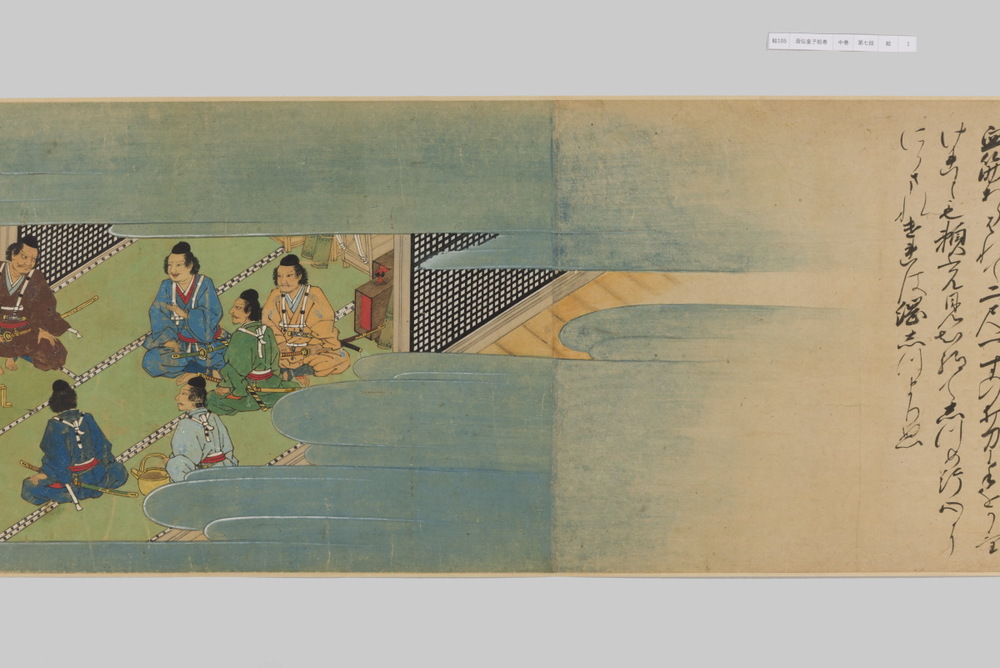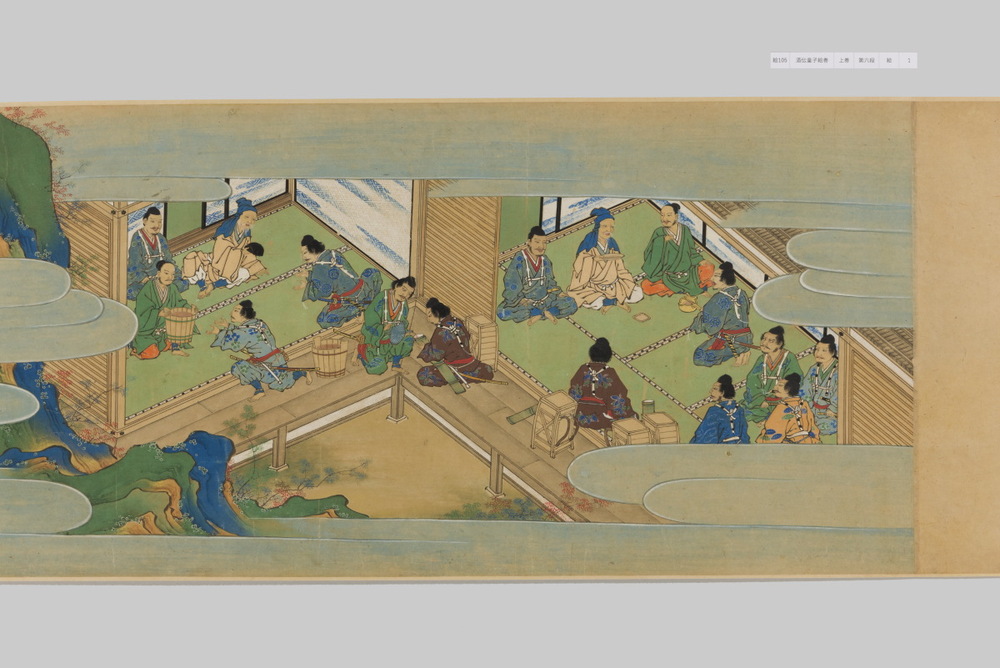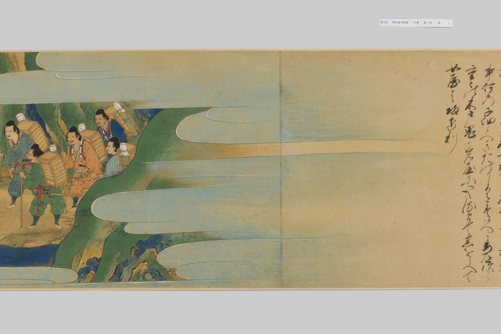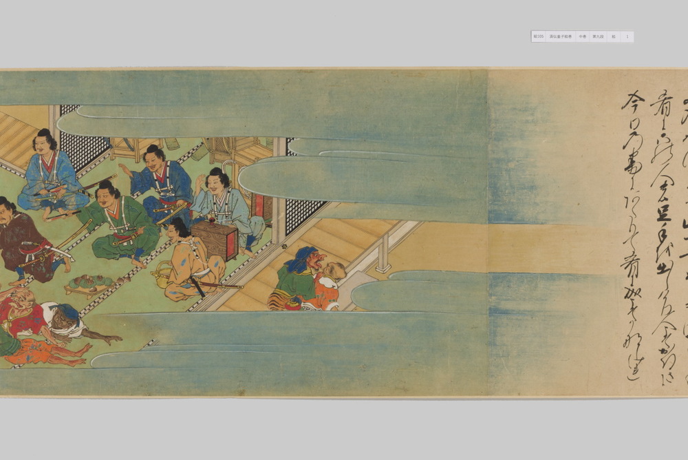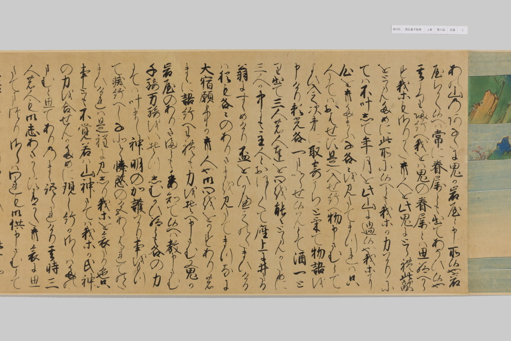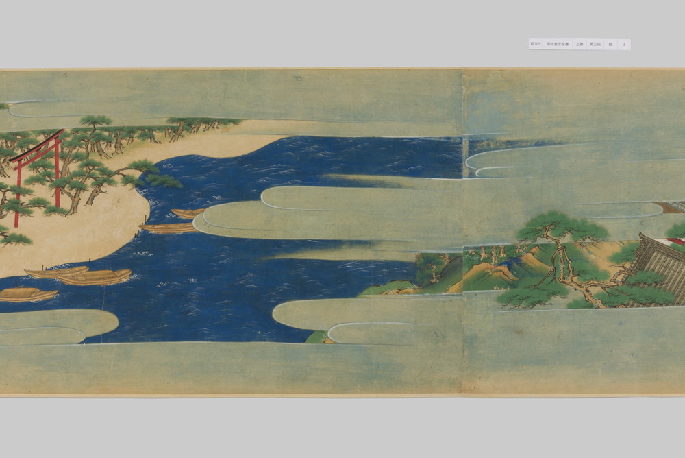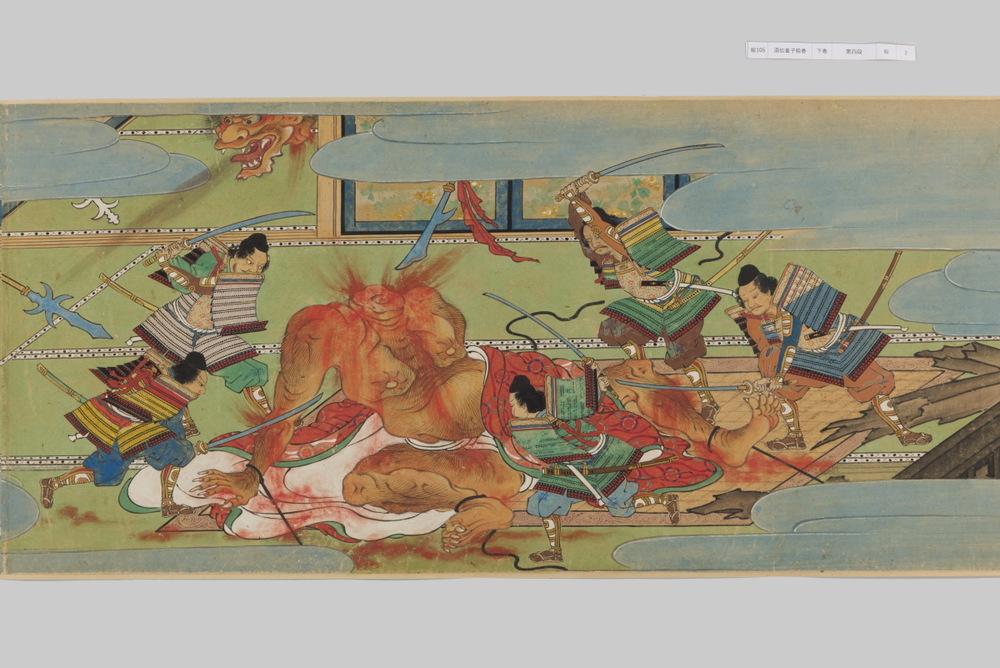 源頼光と家来の四天王、藤原保昌らが八幡・住吉・熊野の諸神の加護を得て、鬼神・酒伝童子を退治する物語を描く。小田原北条氏の二代目・氏綱の発注によるもので、狩野派の二代目・狩野元信とその弟子が絵を手掛けている。緑青や群青などの濃彩に金泥を交えた豪華な描写が目を引く。酒伝童子は酒呑、酒顛などとも表記され、鬼の棲家を丹波大江山、近江伊吹山とする二系統に分かれるが、本絵巻は伊吹山系のなかで現存最古の例とされる。(『サントリー美術館プレミアム・セレクション 新たなる美を求めて』サントリー美術館、2018年)
