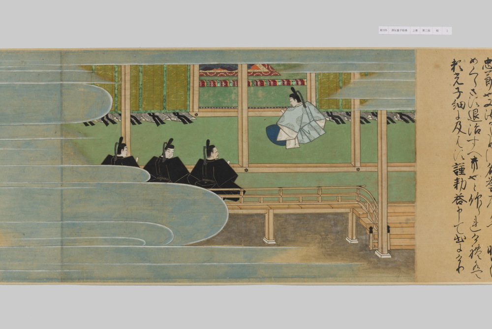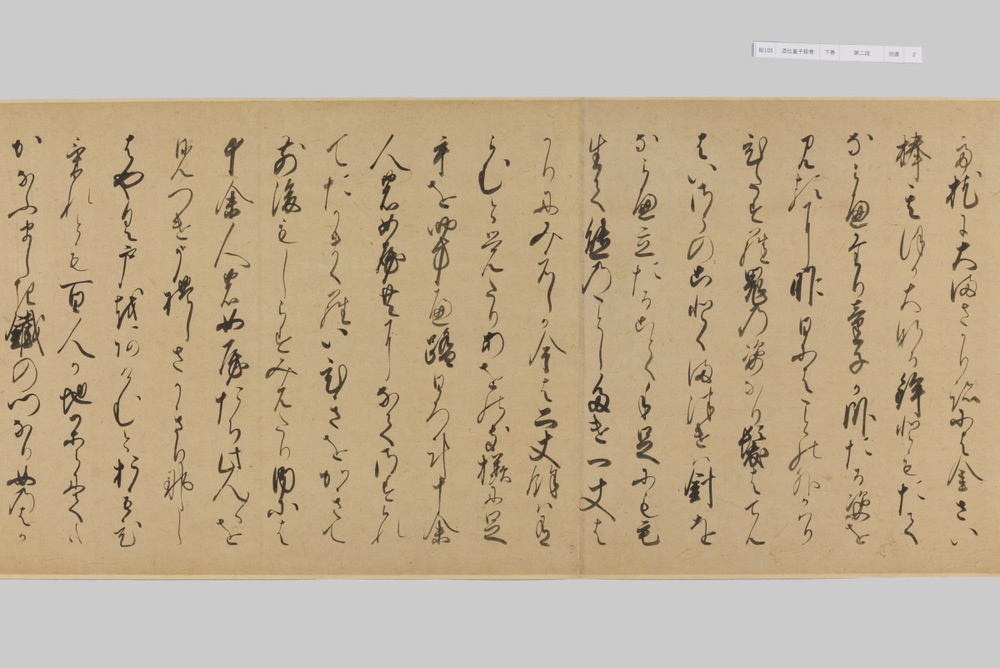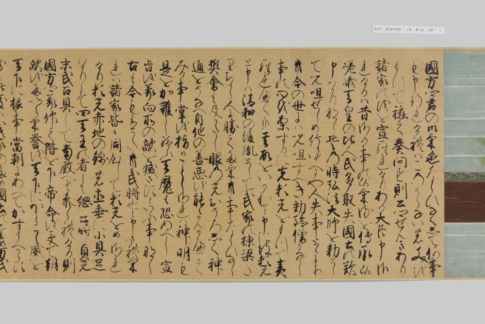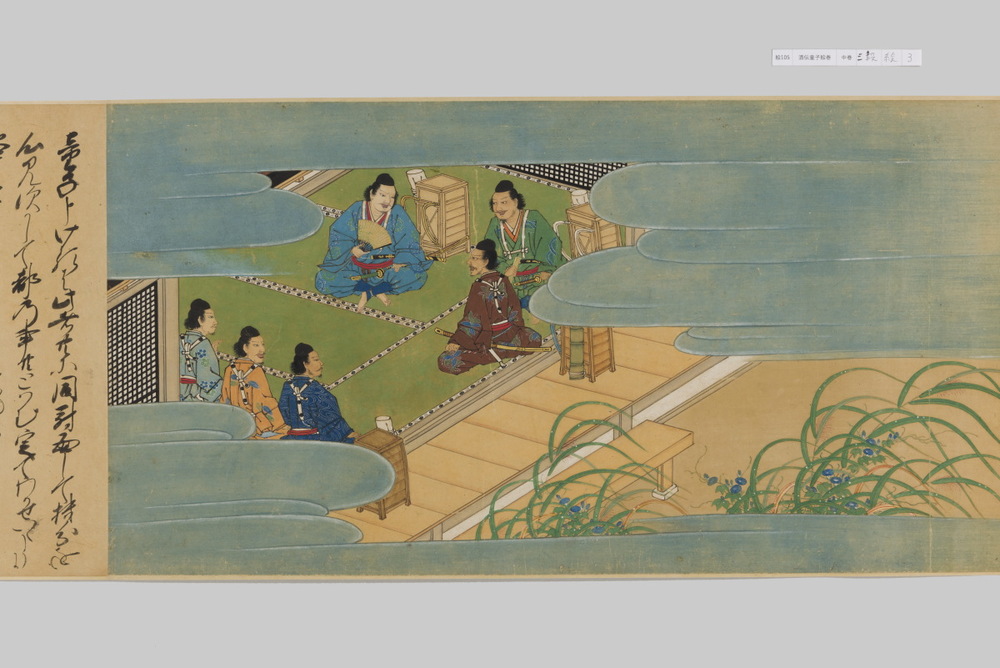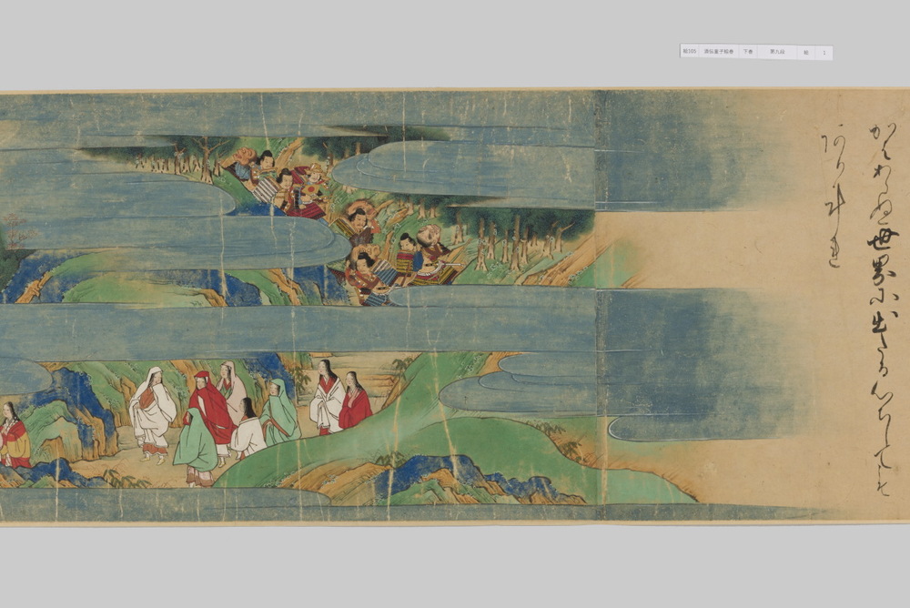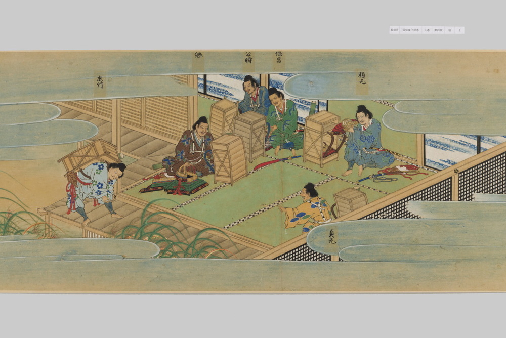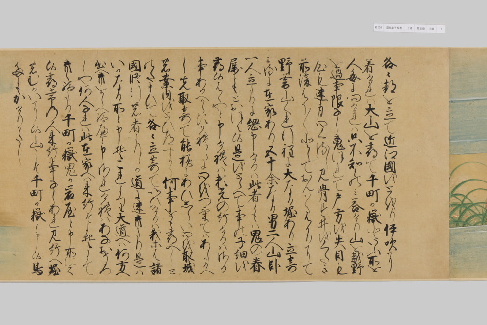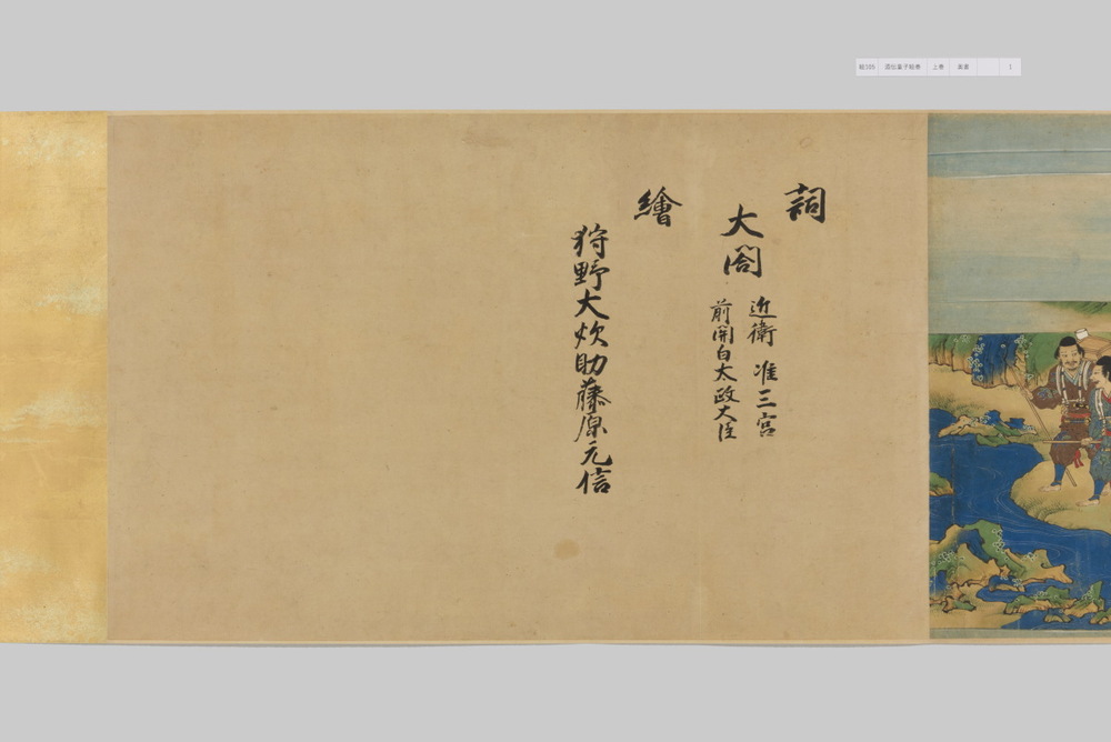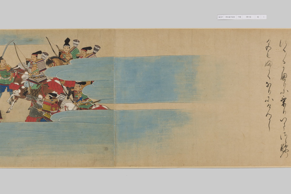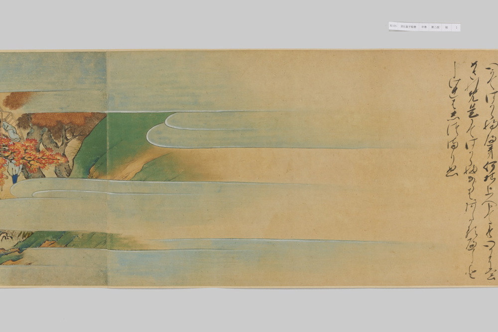 源頼光と家来の四天王、藤原保昌らが八幡・住吉・熊野の諸神の加護を得て、鬼神・酒伝童子を退治する物語を描く。小田原北条氏の二代目・氏綱の発注によるもので、狩野派の二代目・狩野元信とその弟子が絵を手掛けている。緑青や群青などの濃彩に金泥を交えた豪華な描写が目を引く。酒伝童子は酒呑、酒顛などとも表記され、鬼の棲家を丹波大江山、近江伊吹山とする二系統に分かれるが、本絵巻は伊吹山系のなかで現存最古の例とされる。(『サントリー美術館プレミアム・セレクション 新たなる美を求めて』サントリー美術館、2018年)