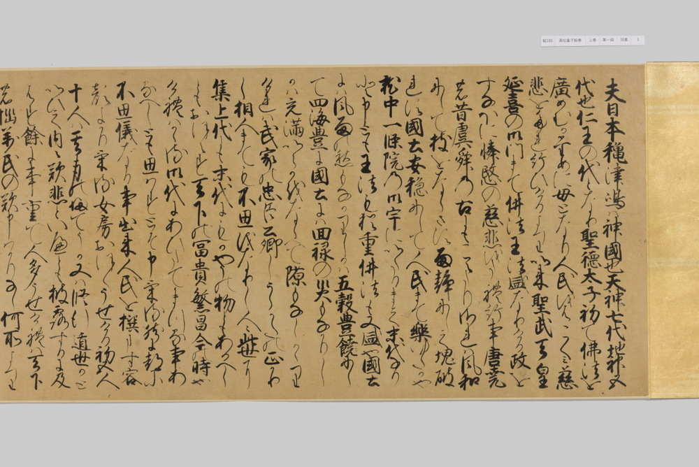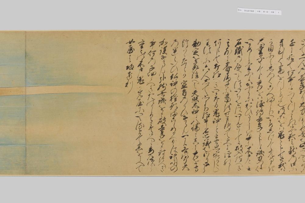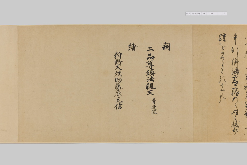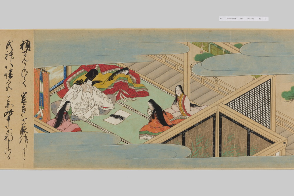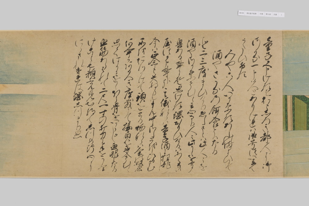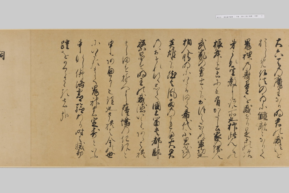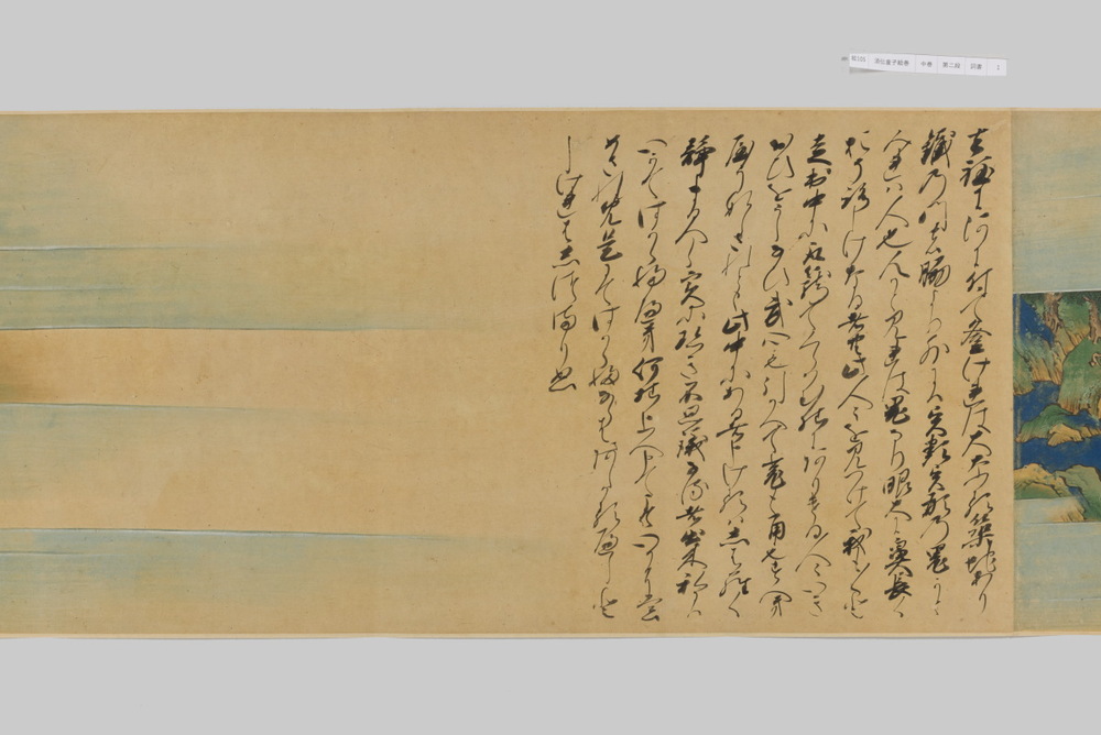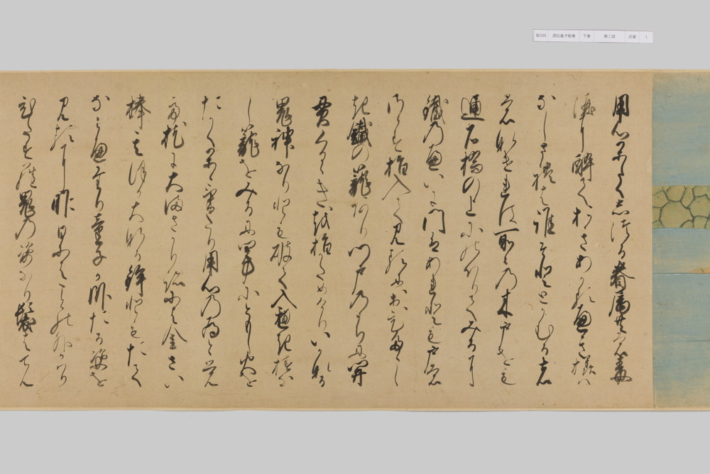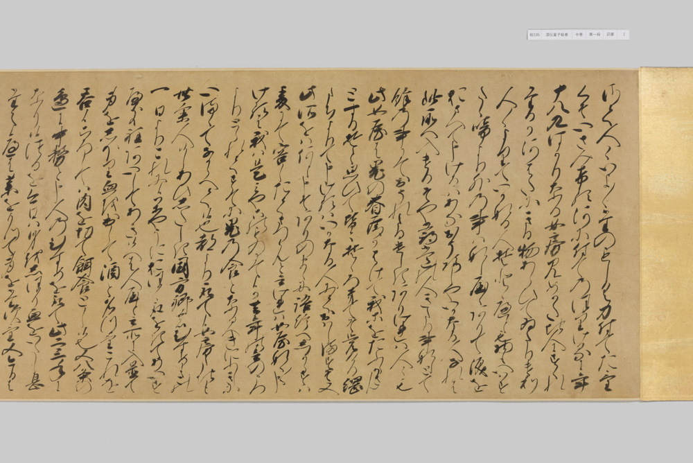 源頼光と家来の四天王、藤原保昌らが八幡・住吉・熊野の諸神の加護を得て、鬼神・酒伝童子を退治する物語を描く。小田原北条氏の二代目・氏綱の発注によるもので、狩野派の二代目・狩野元信とその弟子が絵を手掛けている。緑青や群青などの濃彩に金泥を交えた豪華な描写が目を引く。酒伝童子は酒呑、酒顛などとも表記され、鬼の棲家を丹波大江山、近江伊吹山とする二系統に分かれるが、本絵巻は伊吹山系のなかで現存最古の例とされる。(『サントリー美術館プレミアム・セレクション 新たなる美を求めて』サントリー美術館、2018年)