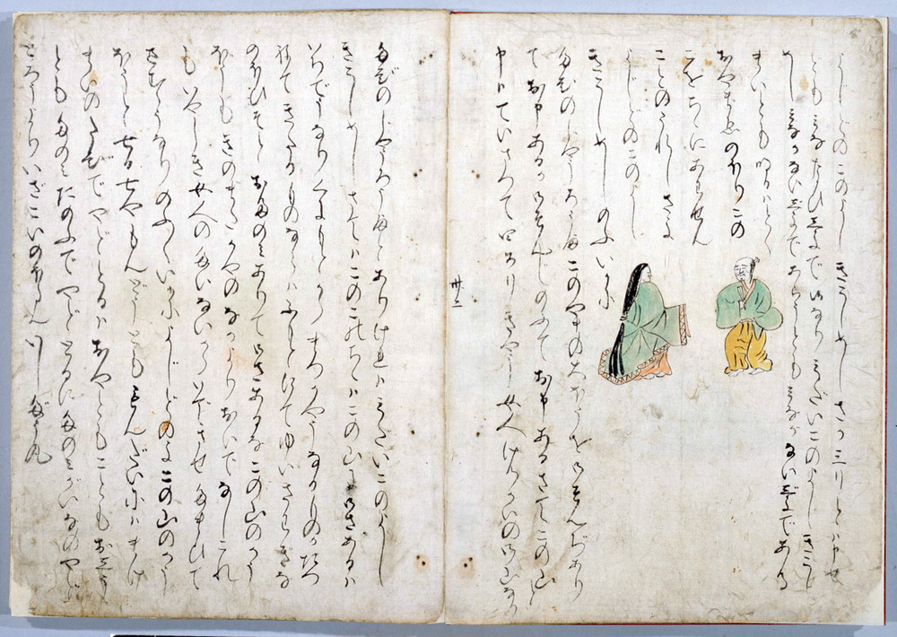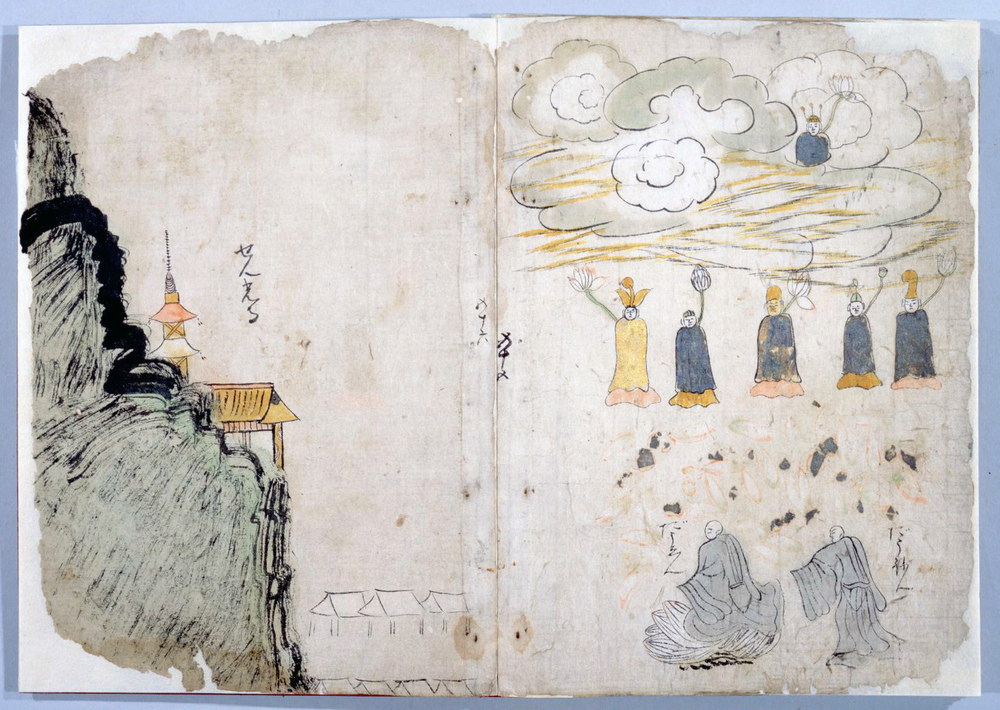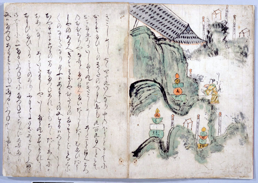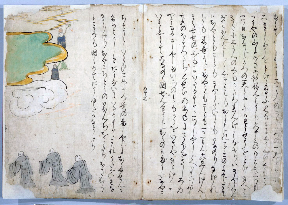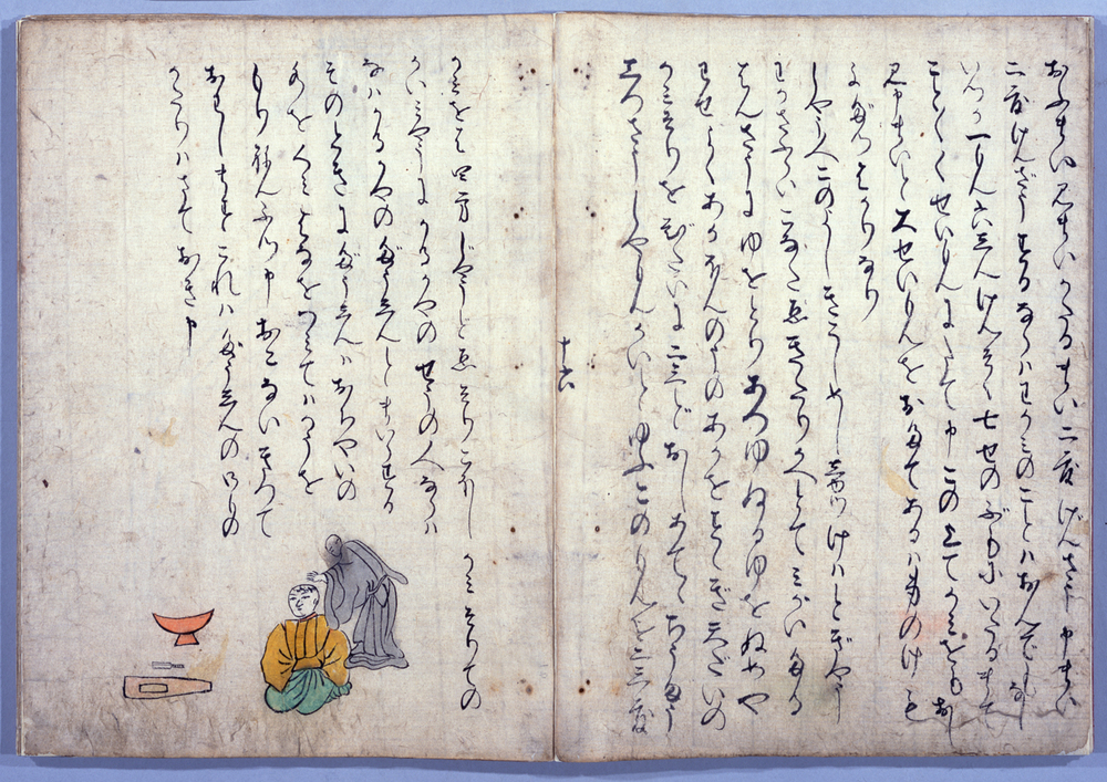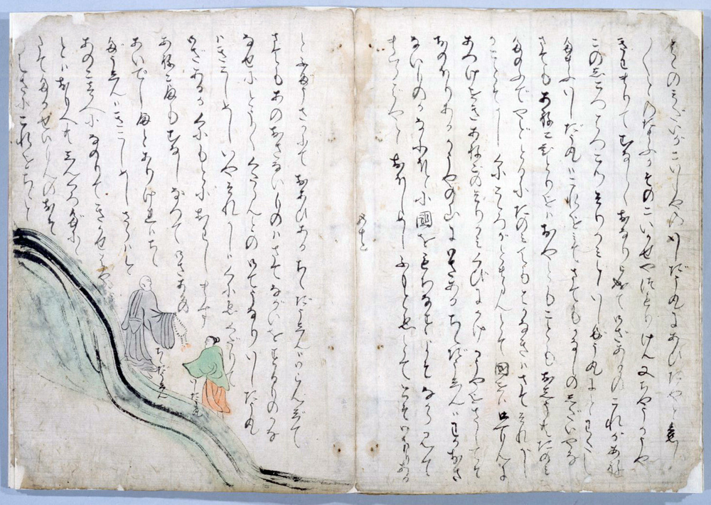 説経「苅萱」の絵入本。絵画化された説経として現存最古のものと推定される。世の無常を感じた加藤重氏は、妻子を残して出家し苅萱道心と名乗る。やがて、息子が父をたずねて高野山へ入るが、道心は父と明かさずに息子を突き放し、一人信濃善光寺に移って往生をとげた。高野山で出家した息子も同日同刻に息を引き取ったという。本文と同筆とみられる絵は、素朴絵の極致と評される。奔放でありながら信仰心に支えられたその表現は、見る者を魅了してやまない。(『サントリー美術館プレミアム・セレクション 新たなる美を求めて』サントリー美術館、2018年)