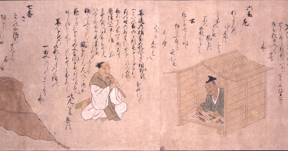三十二種の職人を左右二組に分け、その詠歌の優劣を競う架空の歌合を描く。職人の姿は歌仙絵に倣った坐像ではなく、仕事に従事する個々の空間ごと描かれており、主たる興味は職人の営みを表すことにあったようだ。特に応仁・文明の乱後は、経済の発展に伴って都市にはさまざまな職業が増加した。画中の和歌は、貴族が職人に仮託して詠んだ機知に富むものであり、職人たちに関心の目を向けたのもまた貴族たちであったことがうかがえる。(『サントリー美術館プレミアム・セレクション 新たなる美を求めて』サントリー美術館、2018年)