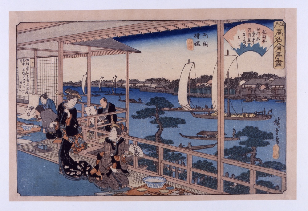江戸の有名な料理屋を取り上げた全30図の揃物で、サントリー美術館はその内の24図を所蔵する。料理屋の内部や外観が様々な季節、天候の風景とともに表され、風景画の名手として知られた広重ならではの描写となっている。各図の扇形のなかには、それぞれの料理屋にちなんだ狂句が記される。本揃物には書画会や句会を行う人々の姿が複数登場しており、当時の料理屋が文化サロンとしても活用されていたことをよく伝えている。(『サントリー美術館プレミアム・セレクション 新たなる美を求めて』、サントリー美術館、2018年)