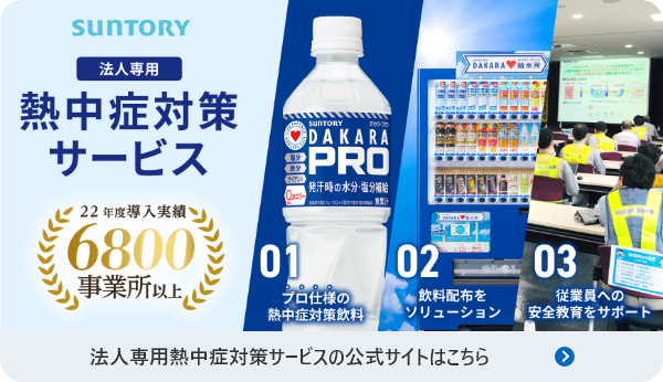 当社の『法人専用熱中症対策サービス』では、『DAKARA PRO』を始めとする熱中症対策飲料をご提供しています。従業員が専用カードを自販機にタッチするだけで、いつでも冷えた飲料を入手でき、利用状況をデータで管理できるサービスです。従業員向けの熱中症対策セミナーなど安全教育のサポートも行っており、ご好評いただいています。詳しくは以下のリンクをご参照ください。