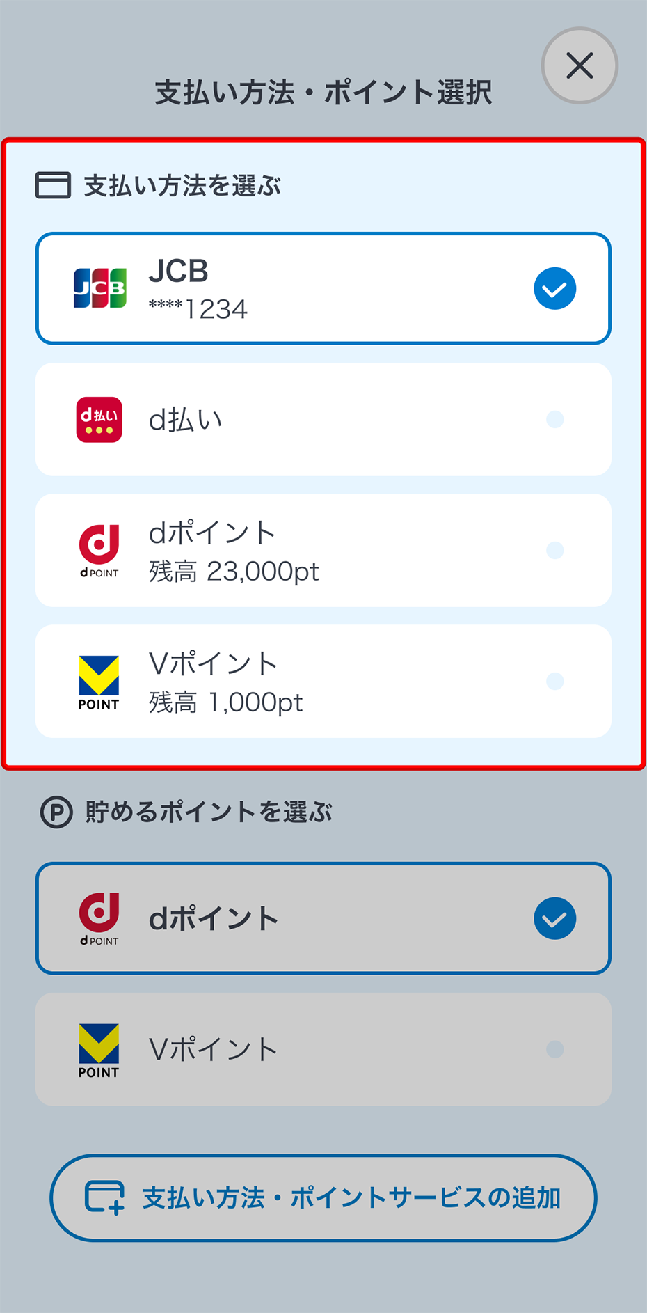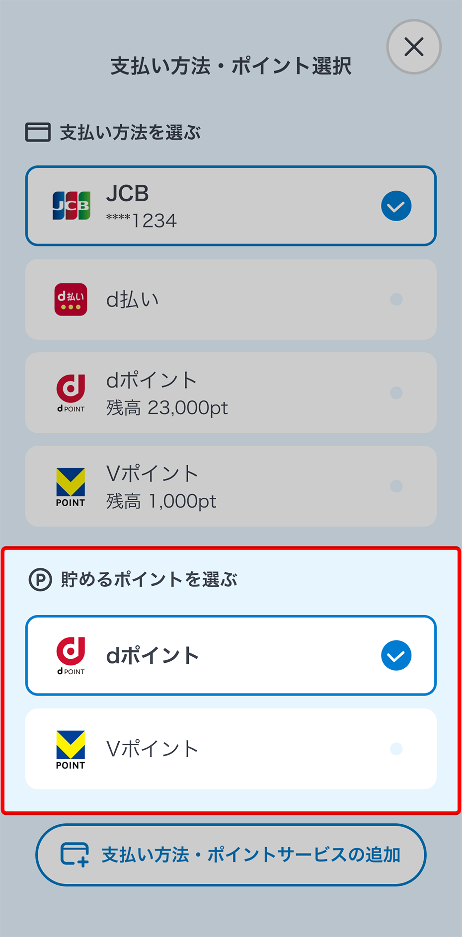②ホーム画面の「支払い方法・ポイント変更」ボタンを押し、連携した共通ポイントを「貯めるポイント」に設定します。