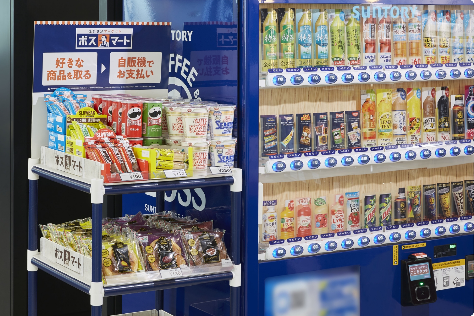 ボスマートは、パンやカップ麺、お菓子などの食品を飲料自販機で購入いただく新しいオフィスコンビニサービスです。自動販売機にキャッシュレス決済端末が取りつけられている場合はご利用可能です。