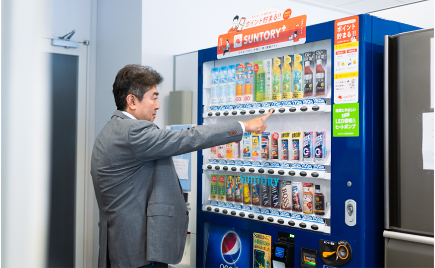 現在、サントリープラス対応の自販機は、本社や国内4ヶ所の製造所に複数台導入されています。例えば豊橋製造所には、現在5台の自販機が設置されています。当初は1台のみでしたが、敷地が広いこともあり、もっと利用しやすくしてほしいとの声が従業員から多く寄せられたため増設しました。他の製造所からも同様の要望があり、複数台設置しています。なおサントリープラスは、グループ会社や協力会社の皆さんにもご利用いただいています。
