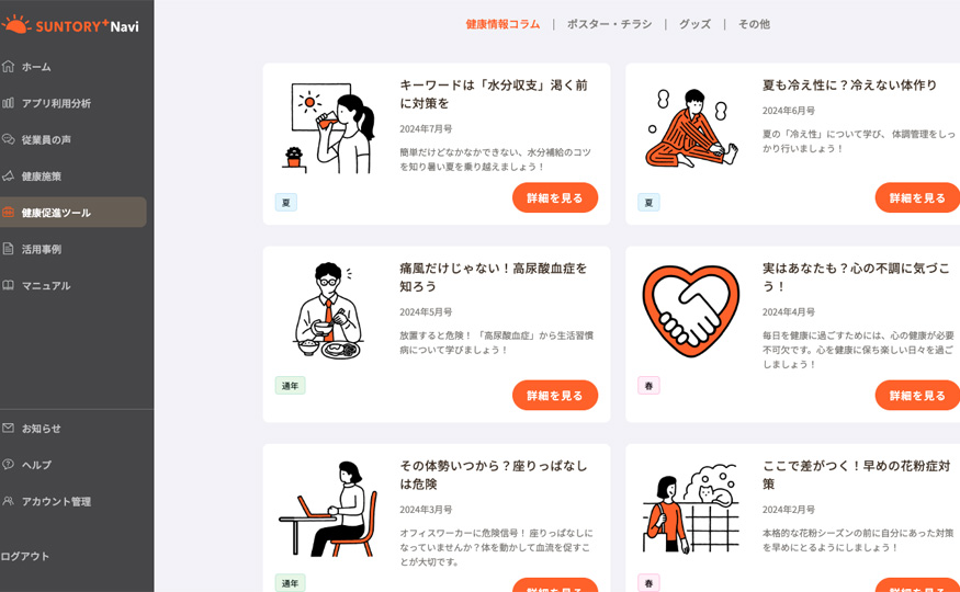 社内の利用率はもちろん、サントリープラスNaviには新規コンテンツなど様々な情報が掲載されていますが、なかでも健康コラムは欠かさずチェックしています。毎月いろいろな季節に合わせた健康情報が掲載されているので各所の看護師にも共有し社内情報の発信にも活用しています。