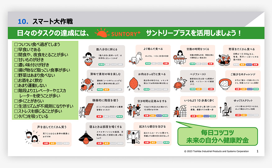 他にも、元々サントリープラスとは別にメタボ対策を従業員に促す施策を行っていました。メタボのチェックリストを作成し「ついつい食べすぎてしまう」「濃い味付けが好き」「歩くことがきらい」など14項目のチェック数に応じてメタボの危険度をセルフチェックできるシートを作ったんです。このチェック項目を作ったときに気づいたのが、14項目中のほとんどがサントリープラスの日常タスクで補える項目だったことです。例えば「ついつい食べすぎてしまう」をチェックした方には「腹八分目に抑える」という日常タスクをおすすめしたりと、メタボ対策にもサントリープラスが活用できることが新たな発見でした。