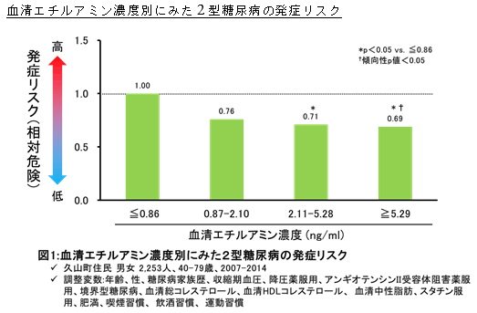 本研究では、2007年の久山町生活習慣病健診を受診した40-79歳の男女2,957人(受診率77.1%)のうち、保存血清から血清エチルアミン濃度を測定出来た非糖尿病の住民2,253人を7年間追跡した結果、血清エチルアミン濃度の上昇に伴い2型糖尿病の発症リスクは有意に低下しました。さらに、肥満およびインスリン抵抗性を有する住民では、血清エチルアミン濃度と2型糖尿病発症の間により強い負の関係を認めました。