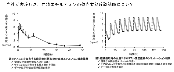 この研究結果を踏まえ、当社では健康な中高齢男女を対象に、緑茶飲料の摂取による血清エチルアミン濃度の推移に関する研究を行いました。その結果、緑茶飲料を継続的に飲用することにより、久山町研究で示された2型糖尿病の発症リスクが低い群の血清エチルアミン濃度を上回る濃度が維持されることが推定されました。