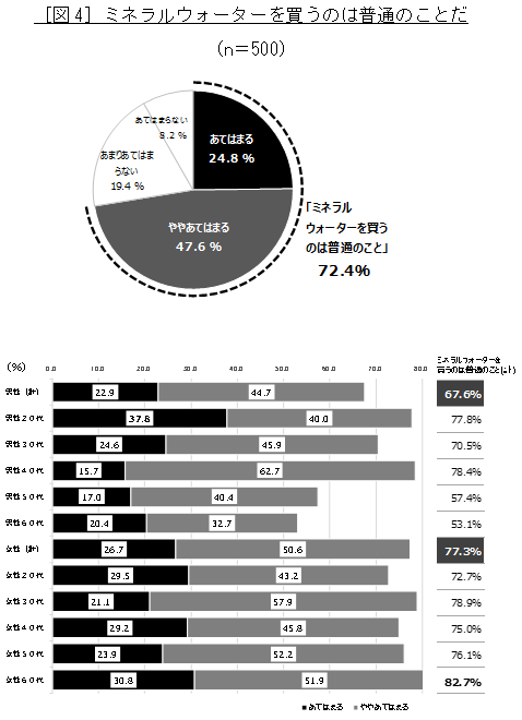 「ミネラルウォーターを買うのは普通のことか」と尋ねたところ、全体の7割以上(72.4%)が「普通のことである」(「あてはまる」24.8%+「ややあてはまる」47.6%)と回答しました。ミネラルウォーターを買うことは、日常生活に定着していることがうかがえます。