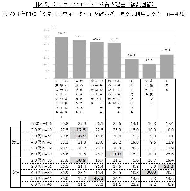 ミネラルウォーターの購入が既に定着している層に加え、安全やおいしさを求めて購入する人がいることもうかがえます。(図5)
