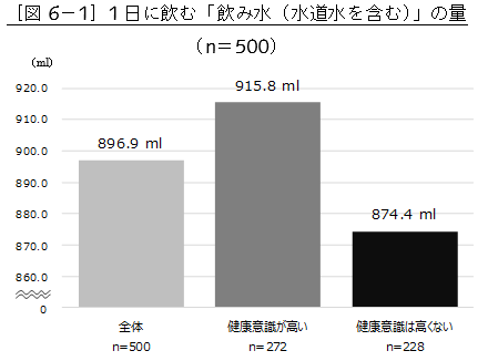 1日に飲む水の量(水道水を含む)は、896.9mlが全体の平均となりました。あらかじめ自分の健康意識について尋ね、「健康意識が高いと思っている人(以下、健康意識が高い人)」と「健康意識が高いと思っていない人(以下、健康意識が高くない人)」で飲む水の量を比べたところ、「健康意識が高い人」は915.8ml、「健康意識が高くない人」は874.4mlとなりました。(図6-1)