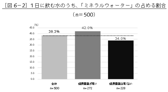 また、1日に飲む水の量全体を100%としたときの「ミネラルウォーター」の割合は、全体では38.3%でしたが、「健康意識が高い人」は42.0%、「健康意識が高くない人」は34.0%で、8ポイント差となりました。(図6-2)