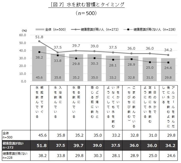 また、その他の項目全てにおいて「健康意識が高い人」の方が実践している割合が大きく、日頃から意識的に水を飲むタイミングを多く作っていることがわかりました。(図7)