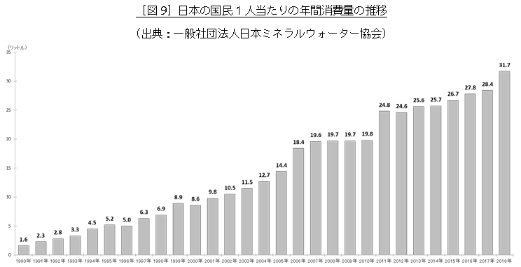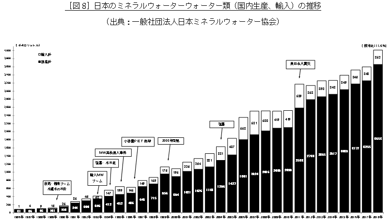 2018(平成30)年の国産ミネラルウォーターの生産量3,658千キロリットル(前年比112.4%)、輸入ミネラルウォーターは352千キロリットル(前年比103.7%)で、合計4,010千キロリットルと過去最大規模となり、国産ミネラルウォーターの生産量は2001(平成13)年以降、18年連続で増加傾向が続いており、2000年と比較すると4倍以上の規模に拡大しています。(図8)