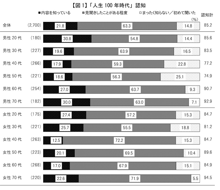 「人生100年時代」の認知率は全体で85.2%と、言葉としては広く知られていることがわかります(図1)。