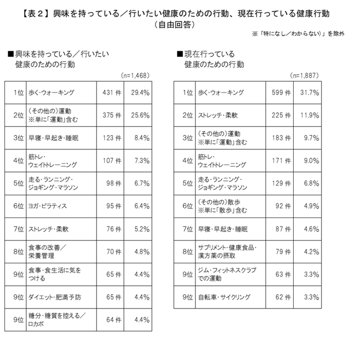 健康のための行動についての自由回答では、興味を持っているもしくは行いたいと思うことの1位は「歩く・ウォーキング(29.4%)」がトップで、次いで「運動(25.6%)」がと上位に挙がりました(表2)。